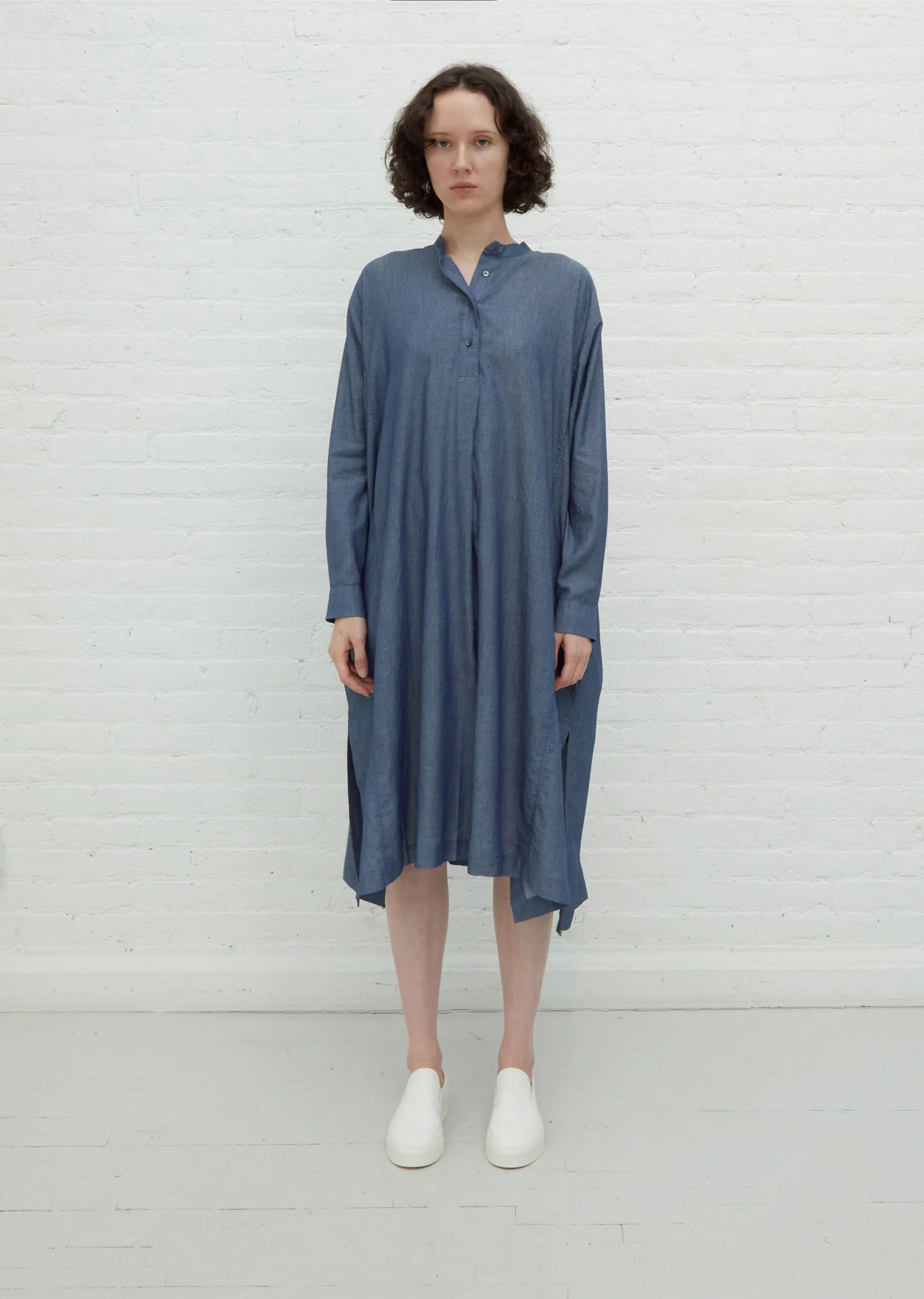 6397 henley dress with a caftan panel construction in lightweight cotton chambray. Features a soft mandarin with a box pleat below buttoned neckline and side slits. Tonal stitching throughtout and finished with tonal shell buttons.