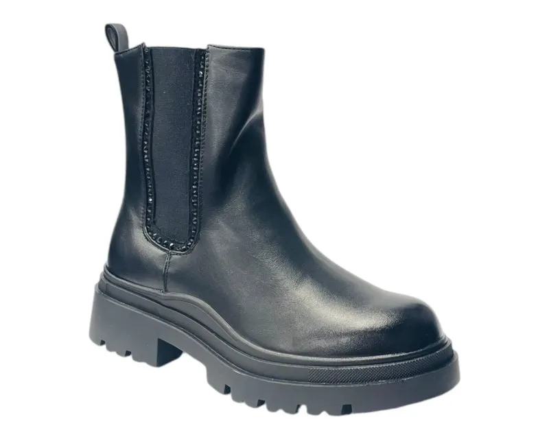 Embrace timeless elegance with these chelsea ankle boots, the perfect balance of timeless elegance and attitude. Crafted with a premium faux leather upper, these boots epitomise quality and durability. With elasticated side panels for easy on-and-off, these boots effortlessly combine convenience and style. The black stud & stone embellishments add a hint of edgy charm, making them a versatile choice to elevate your look. Slip into these ankle boots for a touch of sophistication with an edgy twist.